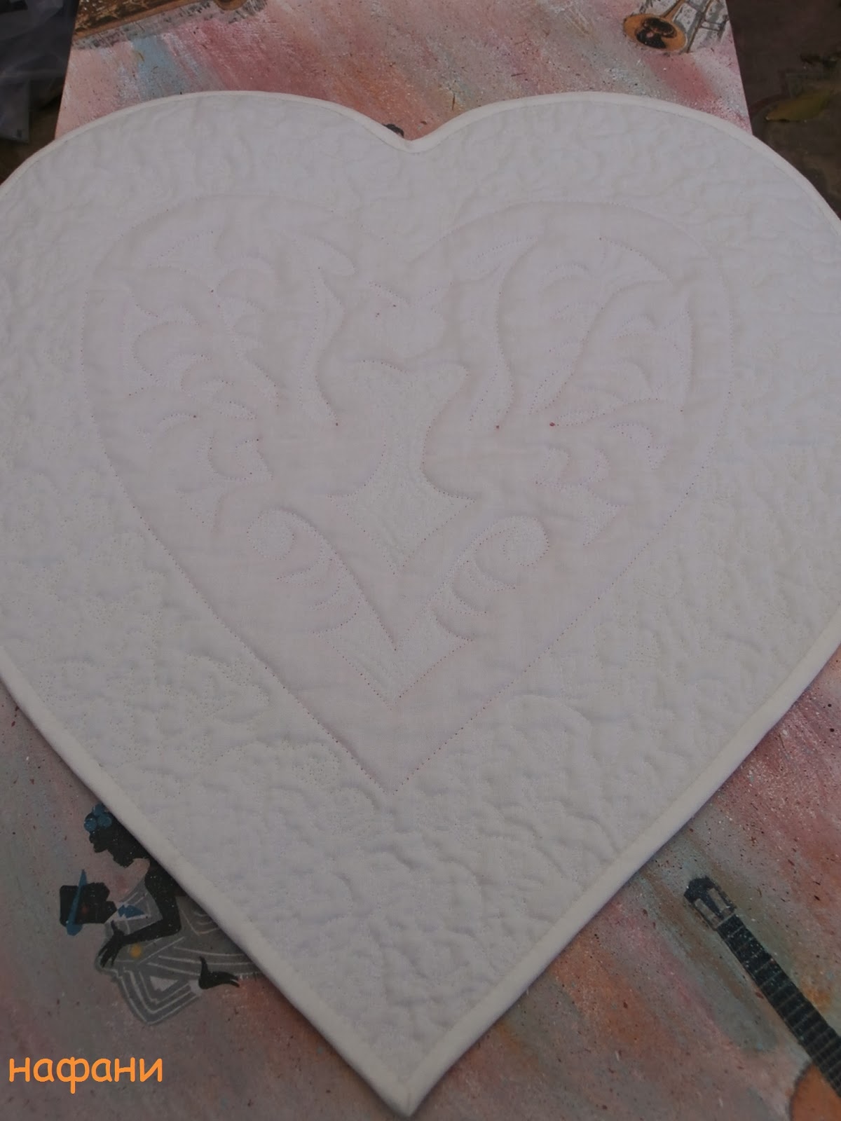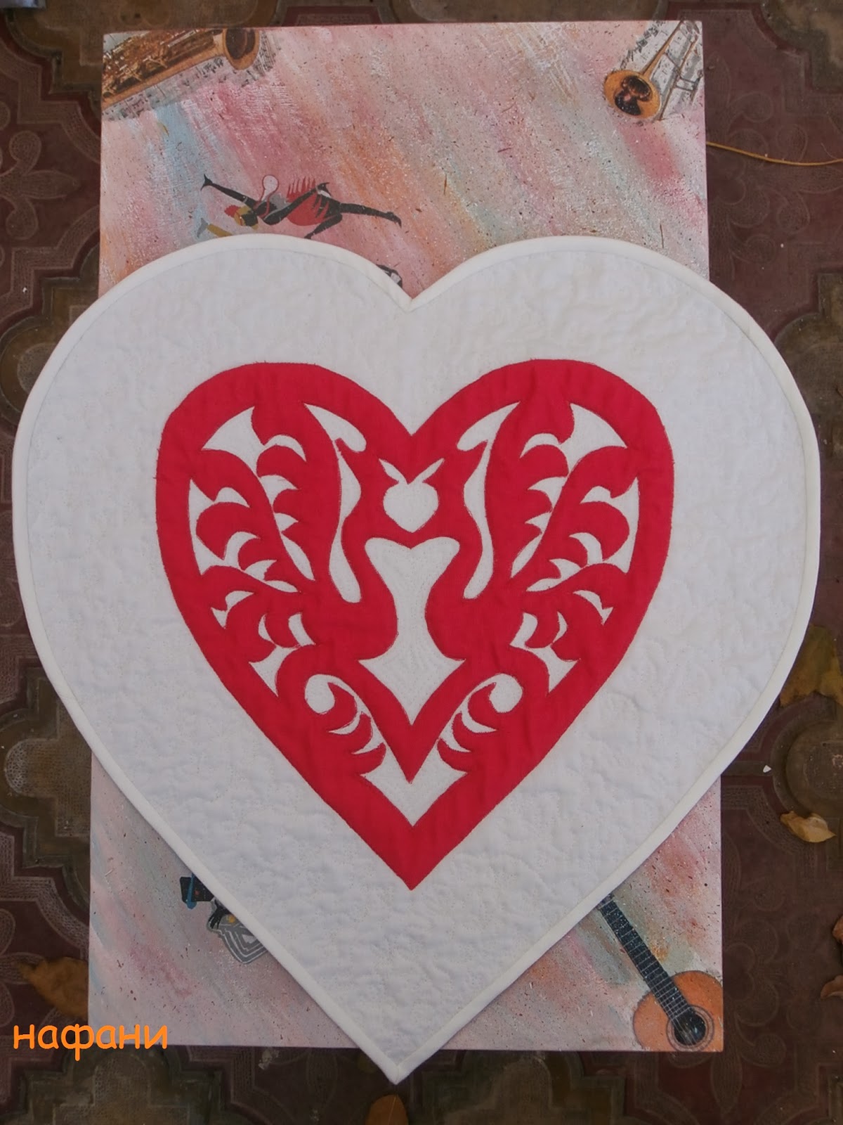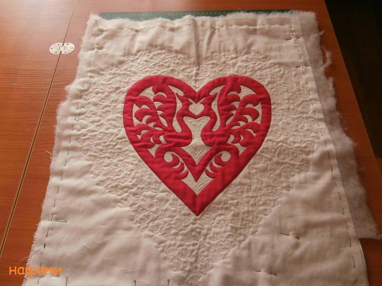 С аппликацией особенных трудов не было. Только вырезать все сначала из бумаги, а потом из ткани, да обойти все зигзагом на маленькой скорости. А вот с покрывной стежкой застопорилось. Дважды начинала, дважды порола, многажды материлась по этому поводу (нет, рукоделие, конечно, успокаивает, но не в таких случаях). Потом плюнула, внутри сердца сделала эхо-контур, а снаружи - листочки с петельками.