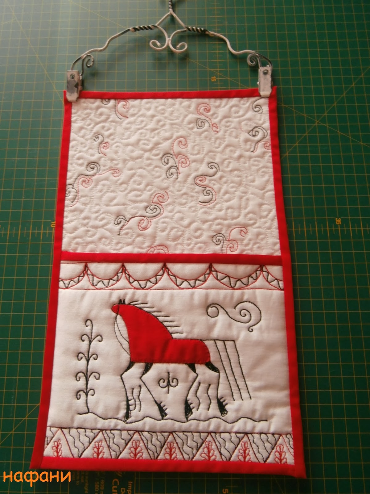 Техника достаточно простая. Корпус лошадки аппликация, все остальное машинная вышивка. Простегивать сам кармашек не стала, показалось, что будет излишне. А вот задник простегала спиралями, и чтобы он не был монотонно скучным, добавила чуть-чуть красных и черных завитков.
