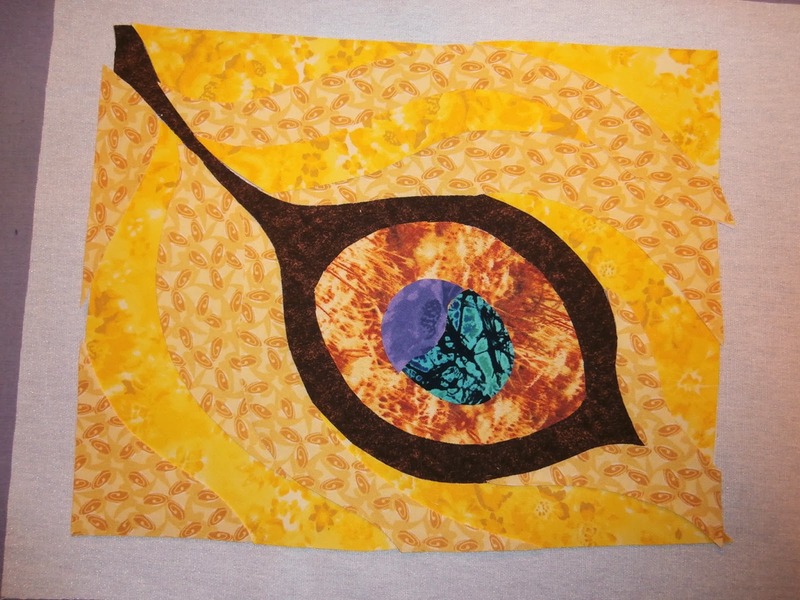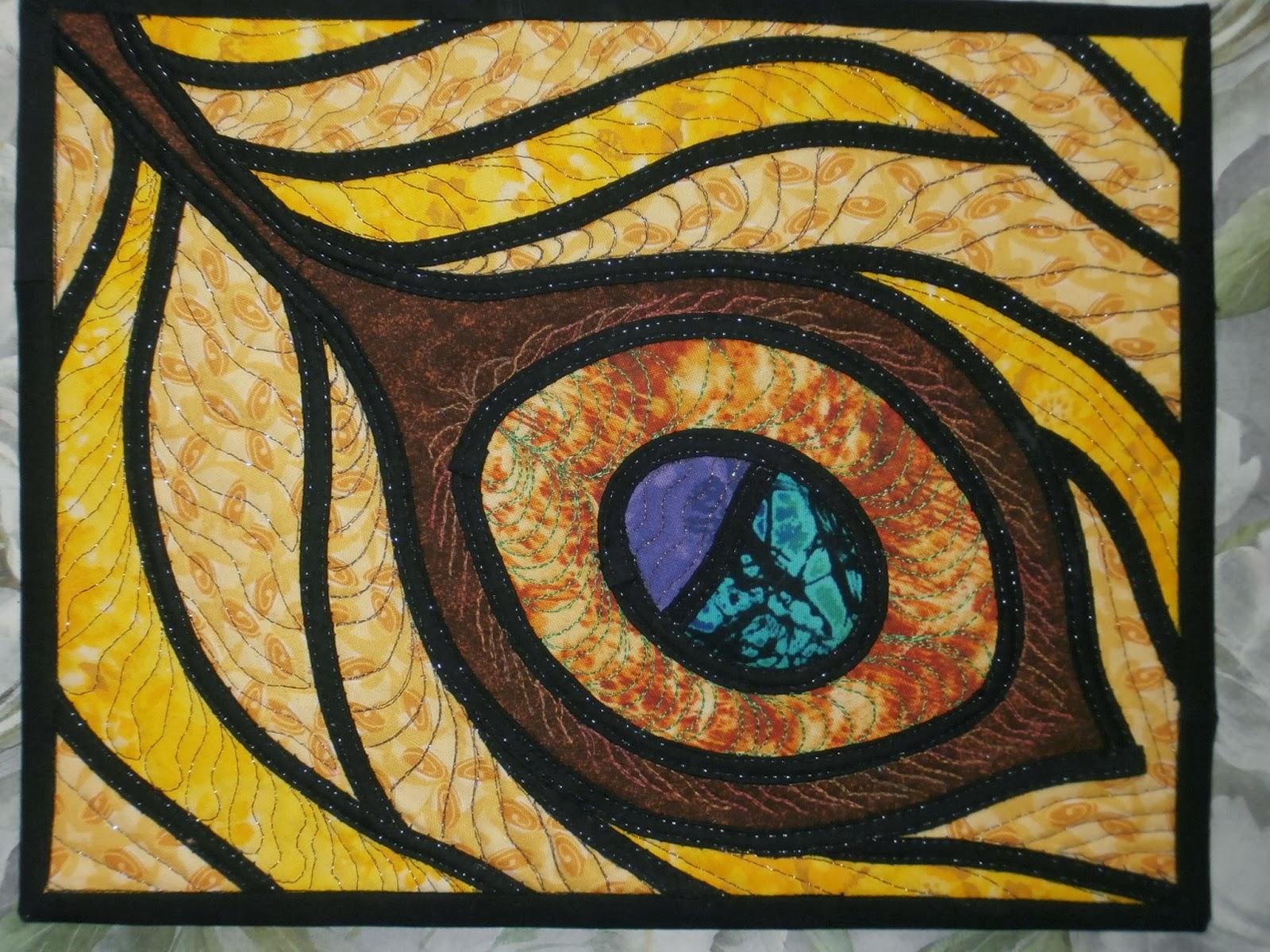 условиями конкурса было использовать только 7 тканей, в честь годовщины, ну и размеры квилта 22 на 28 (вроде бы). Далее, кто на что горазд. Долго думала что же сделать. Но в голове вертелась витражная техника. Давно на нее заглядываюсь, хотела попробовать. Думала, думала, придумала. Павлинье перо.