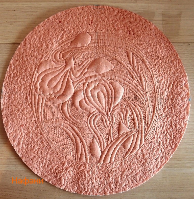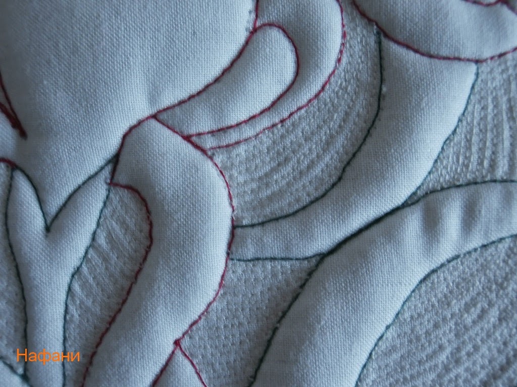 Прошлась цветными нитками по контурам. Вырезала синтепон из ненужных мест, прошлась сплошной стежкой между выпуклыми деталями.