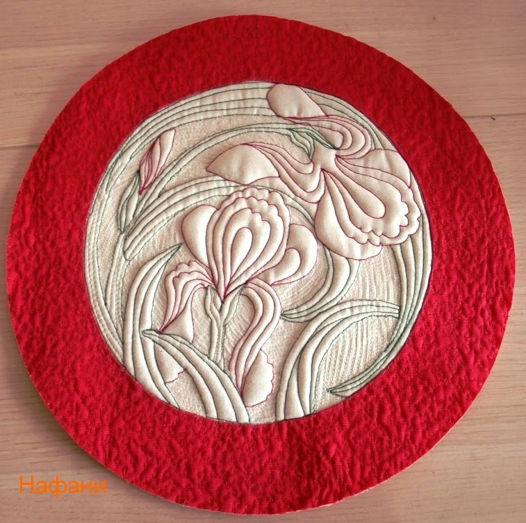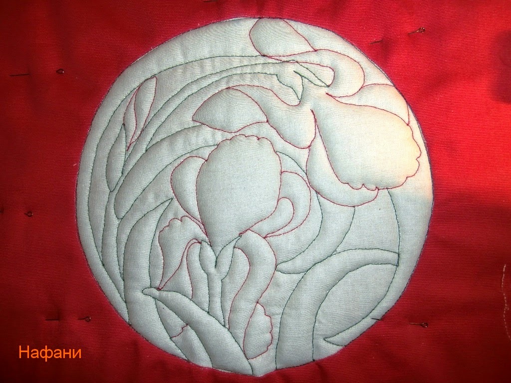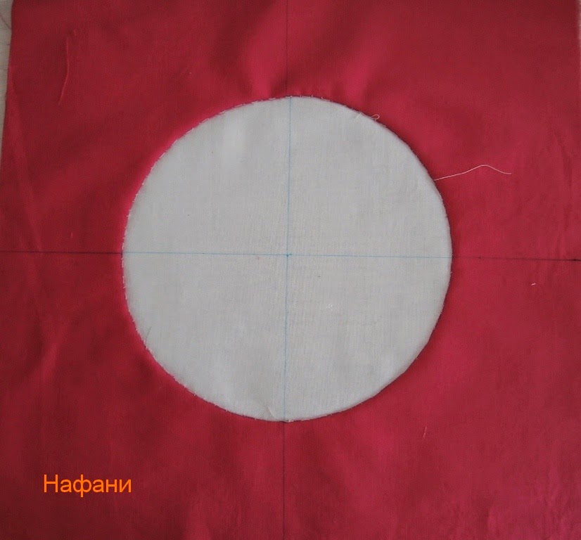 Вшивание кругов оказалось не столь страшным, а даже интересным занятием. Опять воспользовалась помощью с Дублирина.Дальше все просто, перевод рисунка на кальку и строчу по рисунку. Хорошо в последний момент сообразила прорисовать перпендикулярные линии, чтобы направление ткани на обеих сторонах сумки совпадало. Черновой вариант проходила мононитью. Сначала убирала хвостики как положено, потом плюнула и обрезала их без закрепления, за что и поплатилась в нескольких местах. Нить распустилась и кое-где кололись кончики.