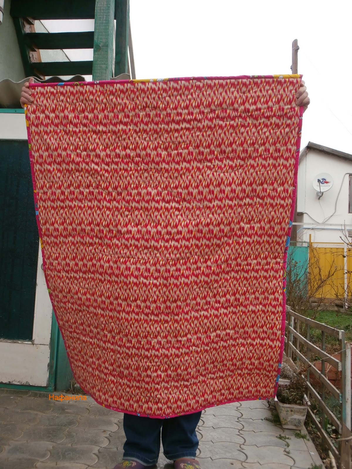 Это одеяло задумывалось для той же пары, но гораздо раньше. Еще в конце 2013 года был сшит топ. Закончить задумывалось к их свадьбе (в апреле). к их приезду в гости (в сентябре), и уже к моему отпуску (февраль 2015). Этот срок был уже самым крайним, поэтому работа велась ускоренным порядком. Практически за неделю одеяло было простегано и закончено. С помощью добрых и незлых слов усилия увенчались успехом. Последние стежки бейки закончила в 2 часа ночи в среду. в четверг постирала, а в пятницу уже ехала в отпуск.